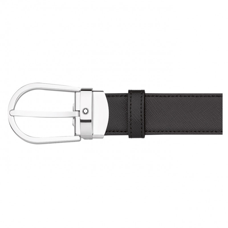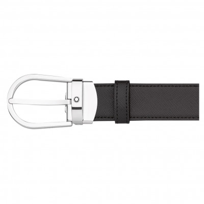 Fibbia ad ardiglione a ferro di cavallo in acciaio pregiato lucido con emblema Montblanc. Cinghia in pelle reversibile nera e marrone stampa Saffiano auto-regolabile, 3 cm x 120 cm.