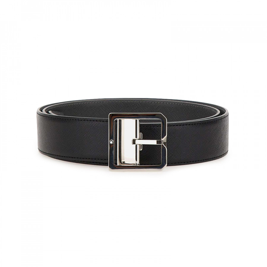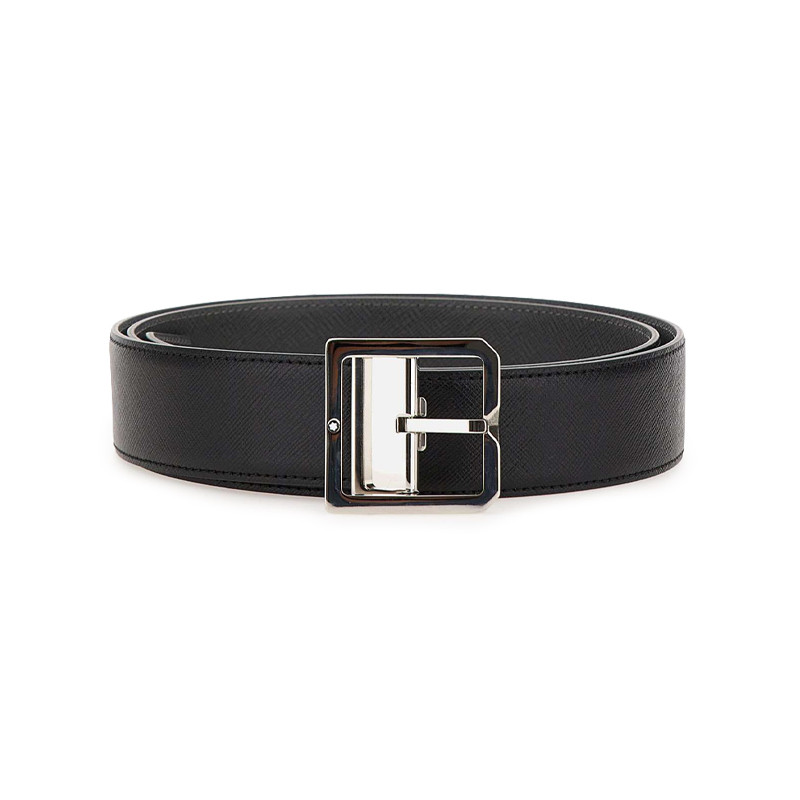 Fibbia quadrata con finitura in palladio. Cintura reversibile e auto-regolabile in pelle saffiano color nero e grigio, con iconico emblema Montblanc. Per un look decisamente grintoso.