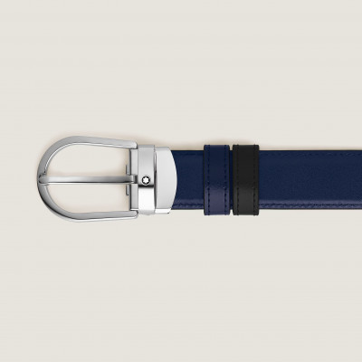Cintura Montblanc reversibile 30 mm in pelle blu/nera con fibbia a ferro di cavallo, collezione Meisterstück.