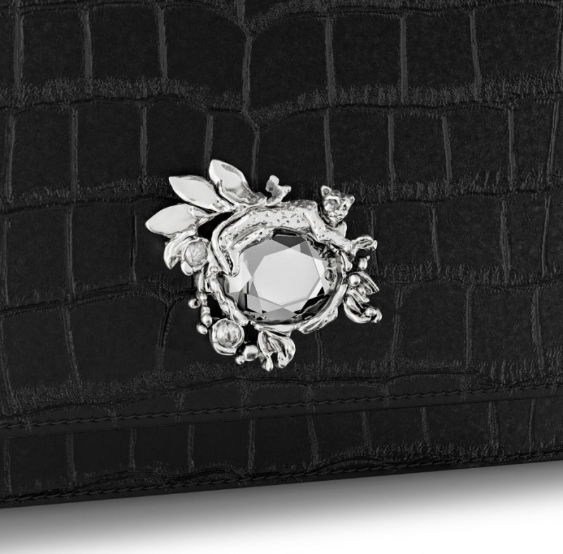 Raffinata ed esclusiva, la pochette Jungle rappresenta una delle novità più distintive della collezione. Realizzata in pregiata pelle croco nera, un vitello lucido di altissima qualità che riproduce con precisione la texture esotica del coccodrillo. La chiusura-gioiello è un vero capolavoro di artigianalità: un leopardo in bronzobianco è posato delicatamente su un cristallo ovale sfaccettato. La chiusura con bottone a pressione nascosto assicura praticità e discrezione, mentre l’interno, sorprendentemente capiente, è dotato di una comoda tasca per custodire gli essenziali. Completata da una catena in metallo di 120 cm, rimovibile tramite due eleganti moschettoni, può essere indossata a mano come clutch oppure a tracolla.