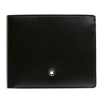 Portafoglio 6 scomparti, in pelle di vitello pieno fiore europea, nero lucido esclusivo Montblanc, fodera jacquard con marchio Montblanc, emblema Montblanc con anello finitura palladio, 6 tasche per carte di credito e fermasoldi. Dimensioni: 11 x 8 cm.