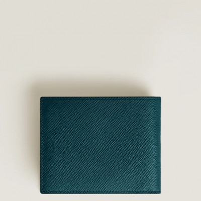 Essenziale per i più esigenti, questo portafoglio compatto si infila facilmente in qualsiasi tasca. Realizzato in pelle blu Cipro con stampa Saffiano, è pensato per contenere sei carte di credito, con due scomparti per le banconote e due tasche per oggetti vari.