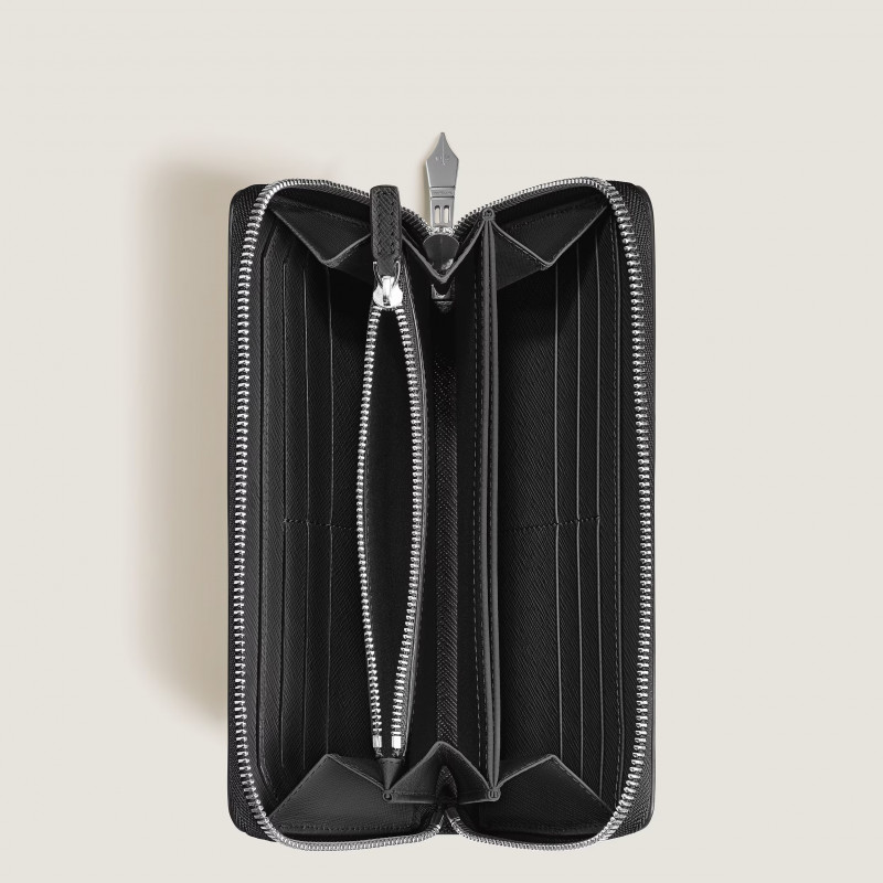 Realizzato in pelle Montblanc Sartorial goffrata nell’elegante tonalità nera, questo portafoglio abbina funzionalità e design raffinato. Il distintivo cursore della cerniera a forma di pennino omaggia la tradizione della scrittura di Montblanc. All’interno, il portafoglio offre aperture per fino a 12 carte di credito, tre scomparti per banconote, un portamonete con cerniera sicuro e tre tasche aggiuntive per effetti personali piccoli.