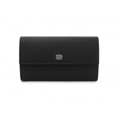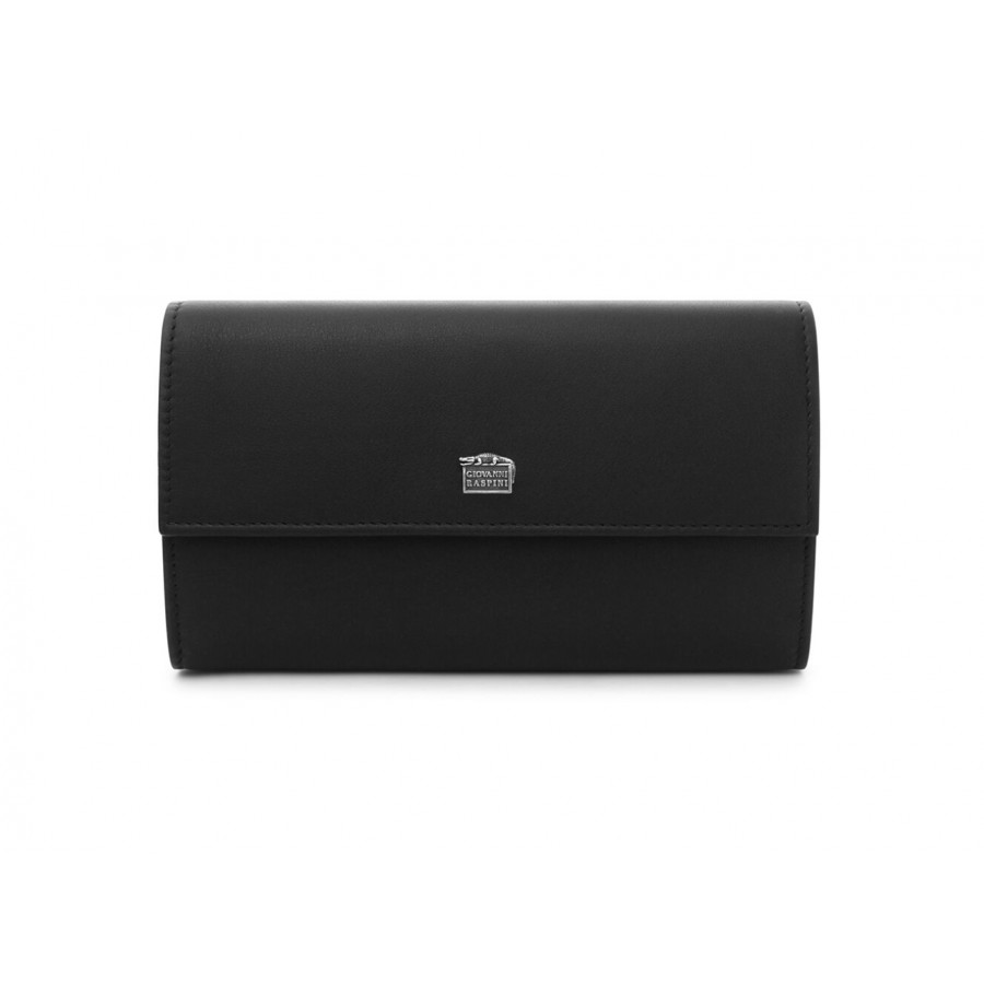 Un portafoglio capiente ed elegante, realizzato in pregiata pelle di vitello pieno fiore liscia nera. Il modello è progettato per mantenere ogni cosa perfettamente organizzata ed offre ben 12 scomparti per carte di credito, due ampie tasche a soffietto per le banconote, una tasca portamonete con chiusura a zip: il tutto è protetto da una patta con chiusura a bottone, che nasconde anche una tasca supplementare. Questo prodotto rappresenta la massima eccellenza artigianale che da sempre contraddistingue il brand Giovanni Raspini, ed è impreziosito da un caratteristico elemento in Argento 925, realizzato in fusione a cera persa e raffigurante il logo del brand in miniatura, sovrastato dall'iconico coccodrillo. Lavorato interamente a mano in Toscana.