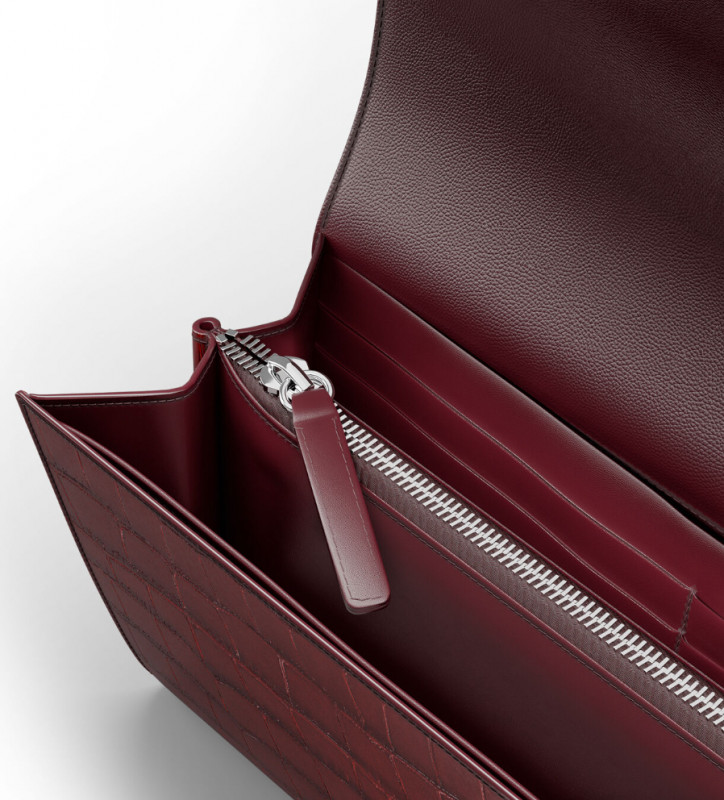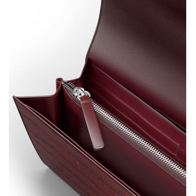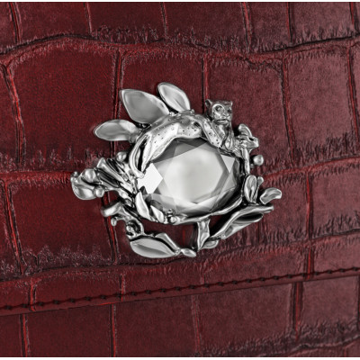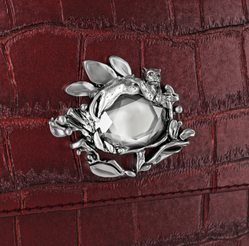Un accessorio di classe intramontabile, questo portafoglio è realizzato artigianalmente in pregiata pelle croco borgogna: un vitello lucido di alta qualità, lavorato per riprodurre con raffinatezza la texture del coccodrillo. Elegante e funzionale, offre un’organizzazione impeccabile grazie ai sei scomparti portacarte, due ampie tasche a soffietto per le banconote e una spaziosa tasca portamonete con chiusura a zip. La patta centrale, impreziosita dalla chiusura-gioiello in bronzobianco rappresentante un leopardo che si adagia su un grande cristallo incolore in taglio ovale sfaccettato, custodisce una tasca supplementare cui corrisponde un vano simmetrico sul lato opposto.