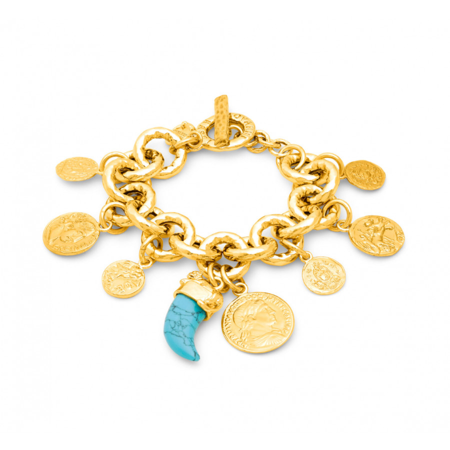 Tutto il fascino della fusione a cera persa in un bracciale a maglia tonda in bronzo dorato con finitura martellata, impreziosito da monete e da una zanna in pasta di turchese sormontata da un decoro a forma di puma. Luminosa e intensa, questa creazione dalle calde cromie è completata da una chiusura a T-bar. Un gioiello fatto a mano, simbolo dell’eleganza materica e della maestria artigianale di Giovanni Raspini.