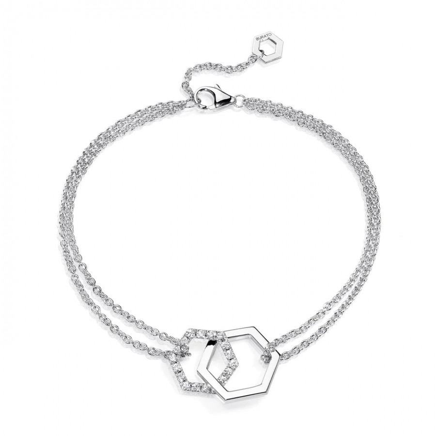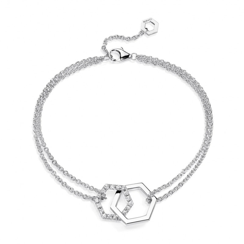 Per sempre connessi in uno scintillante abbraccio. Amuleto Double è un prezioso bracciale con due esagoni realizzati in oro bianco 18 carati e diamanti 0,18 F VVS ct. collegati tra loro come anime gemelle.