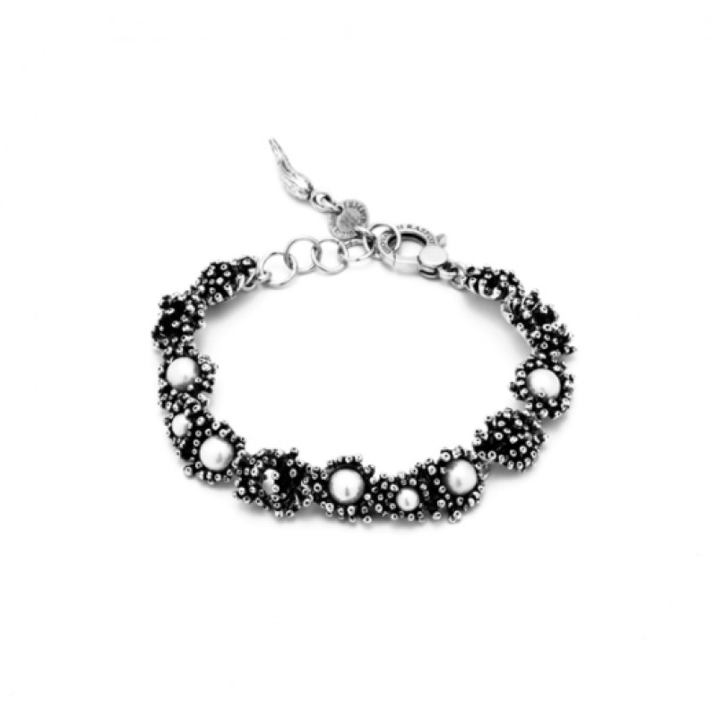 Collezione Anemone -Il bracciale Anemone Piccolo, in argento brunito e perle naturali, regala gioia e sincera bellezza, oltre ad un pratico indosso. In esso il decoro naturalistico si fonde con la delicatezza delle perle di fiume e il fascino eterno delle profondità marine.