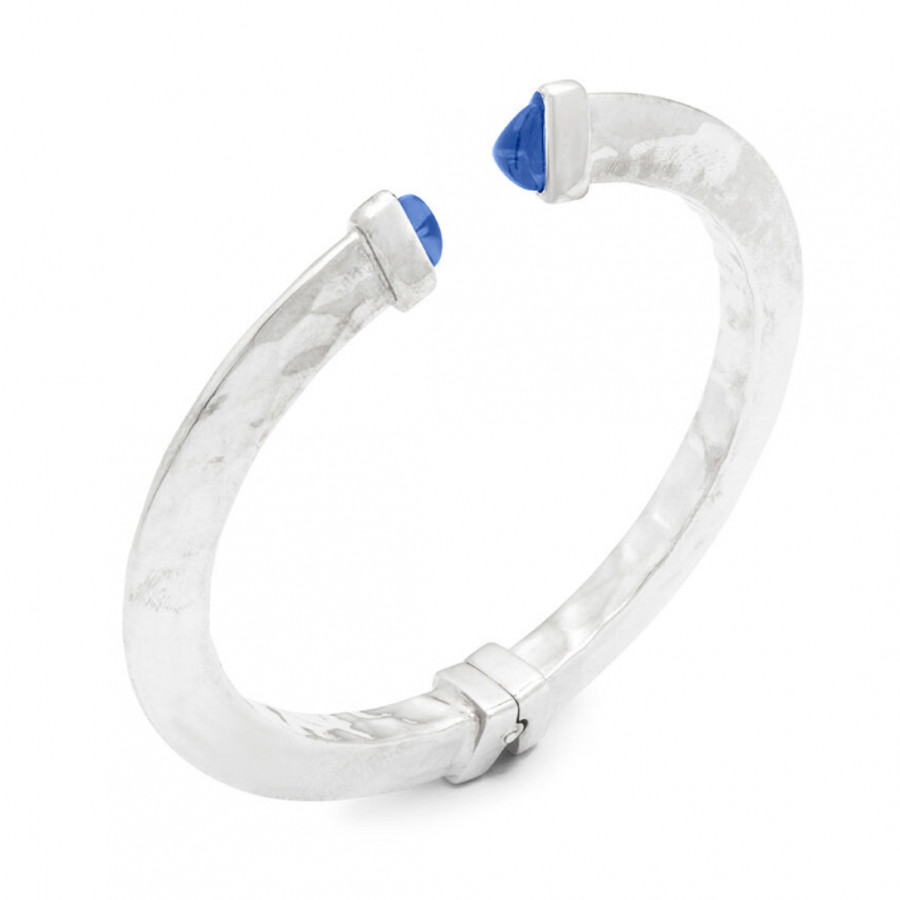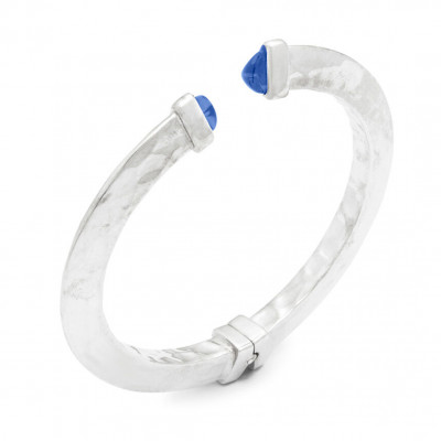 Questo piccolo bangle è un gioiello che si distingue per il gioco sofisticato di volumi, riflessi e il tocco di energia cromatica dei cristalli blu, posti alle estremità. Il bracciale viene realizzato con lastra d'argento martellata a mano e successivamente piegata. Ideale per essere mixato con altri bangle di varie dimensioni.