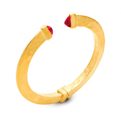 Questo piccolo bangle in argento dorato fonde sapientemente volumi audaci e riflessi sofisticati. Alle due estremità, due luminosi cristalli rossi aggiungono un vibrante tocco di energia cromatica. Un gioiello iconico dal design audace, sapientemente lavorato a mano, ideale per essere mixato con altri bangle di varie dimensioni.