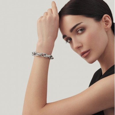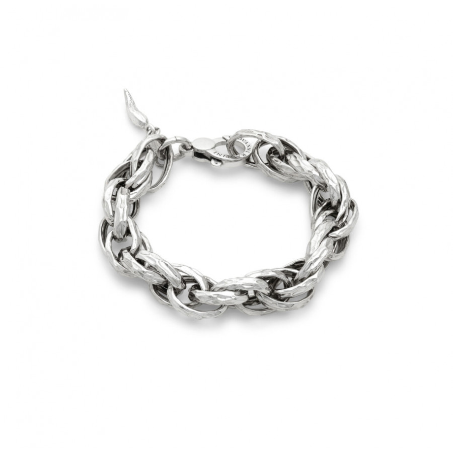 Giovanni Raspini sceglie una catena in argento martellato ad intreccio torchon, e la trasforma in un bracciale raffinato e di grande impatto. L'effetto martellato amplifica la rifrazione della luce, valorizzando l'elegante texture realizzata a mano in azienda.