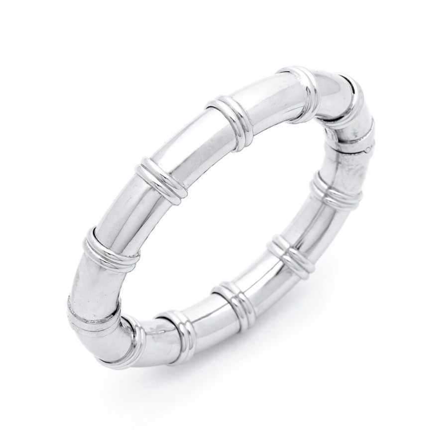 Un bracciale dal design contemporaneo, in argento, adatto anche ad abbinamenti con altre creazioni del mondo Giovanni Raspini. La lavorazione a canna vuota arricchita da coppie di anelli torniti e saldati sul gioiello, regala al bangle Jackie un aspetto lineare e di grande luminosità. Lavorato a mano in azienda.
