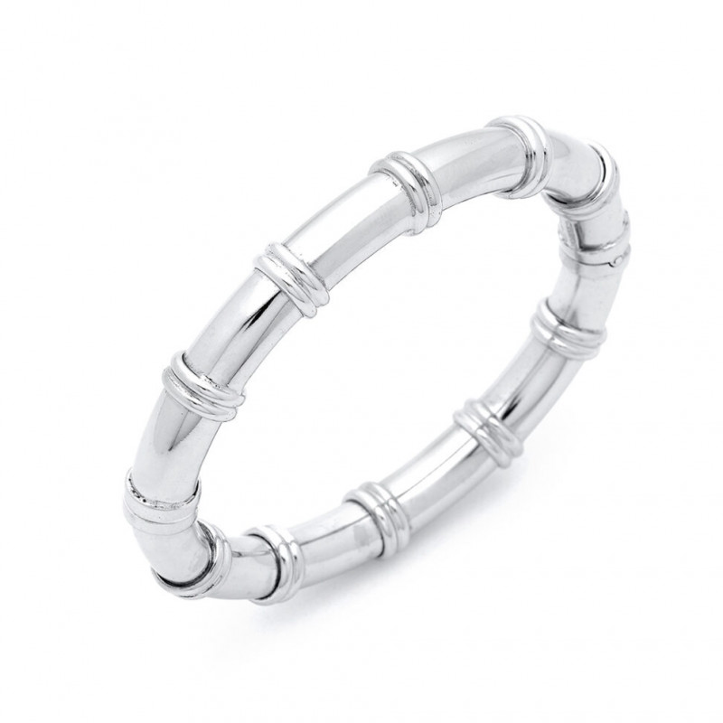 Un bracciale in argento classico e contemporaneo da indossare in ogni occasione. La lavorazione a canna vuota arricchita da coppie di anelli torniti e saldati sul gioiello, regala a questo bangle un aspetto lineare e di grande luminosità. Fatto a mano in azienda.