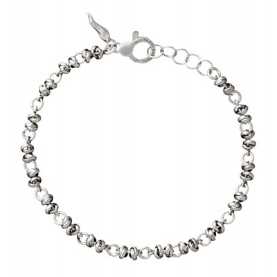 Ritmo ed eleganza contemporanea, grazie al susseguirsi di coppie di maglie intrecciate, su una base di sezioni realizzate a mano in fusione a cera persa: una sequenza delicata e preziosa. Questo bracciale in argento è realizzato completamente in azienda.