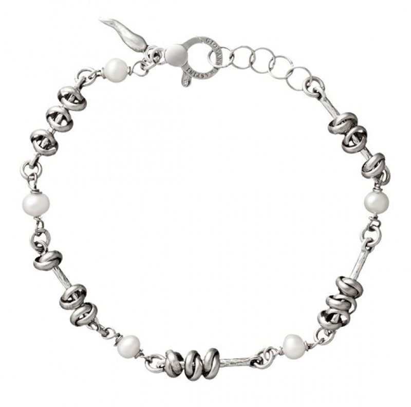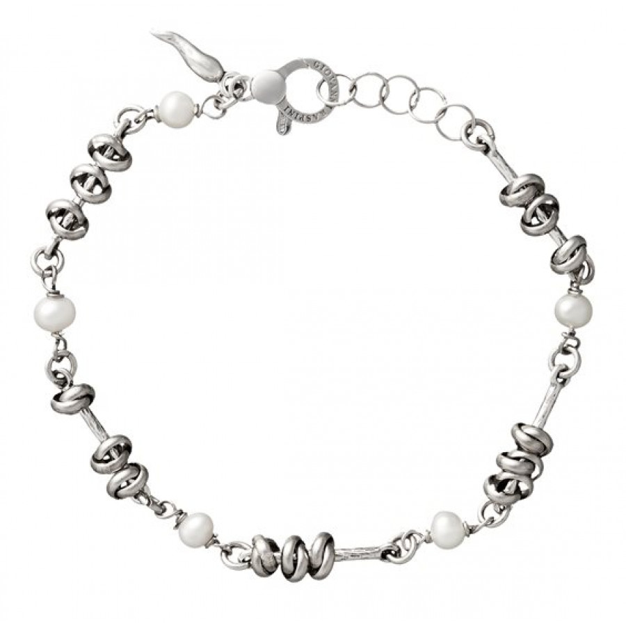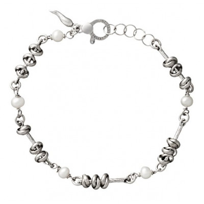 Un delicato bracciale in argento e perle naturali. Le sezioni rigide, realizzate con la tradizionale tecnica della fusione a cera persa ed arricchite da coppie di cimbelline intrecciate, si alternano alle luminose perle di acqua dolce. Leggero ed elegante, il gioiello diviene unico e prezioso grazie alla cura delle lavorazioni artigianali di Giovanni Raspini.