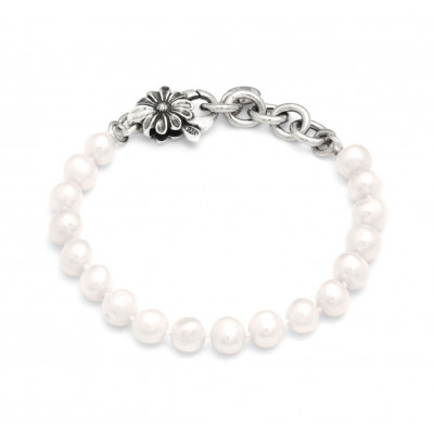 Questo elegante bracciale nasce dal dialogo fra l'argento e la perla, regina della gioielleria. Protagonista ne è la chiusura-decoro in argento brunito a forma di margherita, da sempre motivo evergreen della Maison Giovanni Raspini. Le piccole perle naturali di acqua dolce sono annodate in filo di cotone come tradizione. Il bracciale è provvisto di maglie di regolazione in argento. Il bracciale è realizzato a mano in azienda.