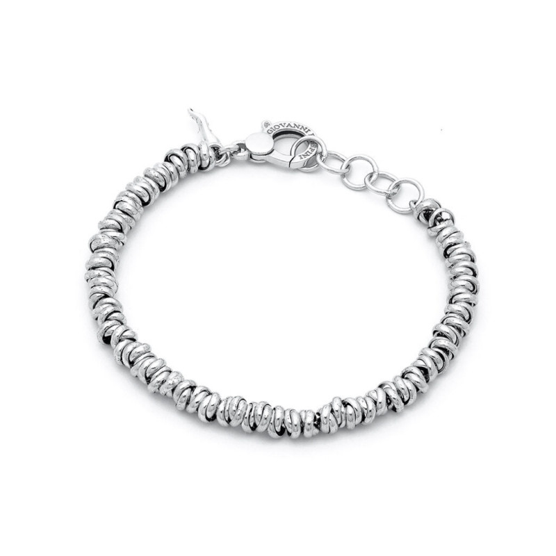 Delicato ed elegante, questo bracciale è caratterizzato da tante coppie di anellini in argento annodati l’uno sull’altro, che donano un effetto molto luminoso. Realizzato artigianalmente in azienda.