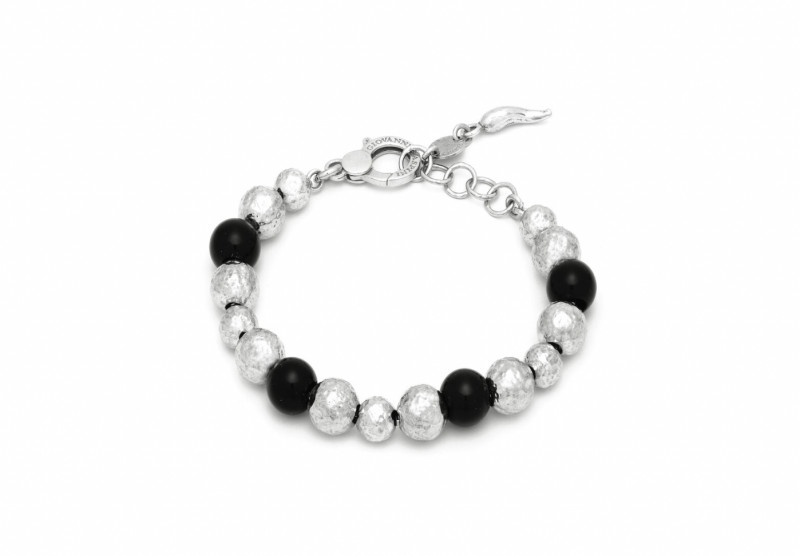 Il Bracciale Optical Grande è realizzato con tante sferette in argento martellato alternate a sfere lucide di onice nera. Ispirato alla moda anni '60, questo bracciale è creato a mano in Italia e si presenta con chiusura con moschettone con malie di regolazione.