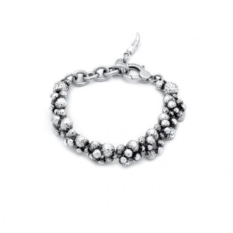 Un bracciale unico, caratterizzato da sferette in argento brunito ad effetto martellato che si rincorrono, catturando e riflettendo la luce in modo particolarissimo. Questo gioiello racconta tutto il fascino antico e contemporaneo della fusione a cera persa. Realizzato completamente a mano in azienda.