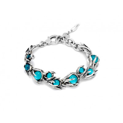 Un gioiello classico e contemporaneo da indossare al tuo polso. Filamenti in argento - ondeggianti fra le correnti oceaniche - incastonano madreperle naturali doppiate con quarzo, turchesi come l'acqua limpida e profonda. Un bracciale che regala luce e colore, unendo elementi naturalistici con una resa plastica dell'argento assolutamente contemporanea. Fatto completamente a mano in house.