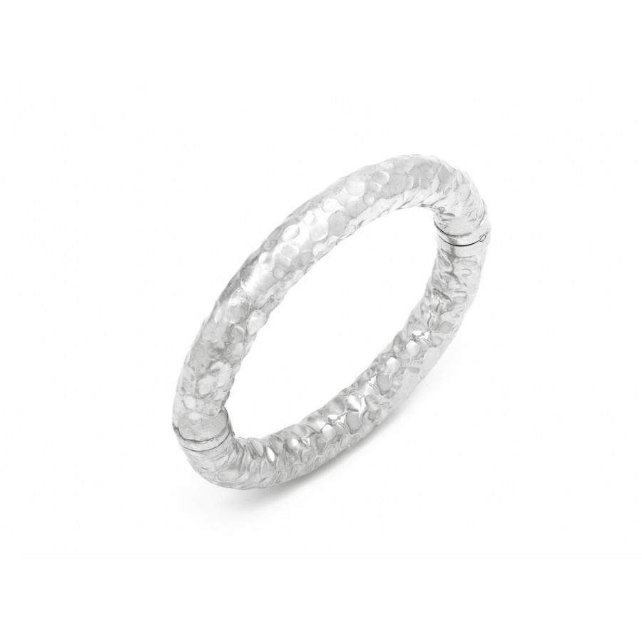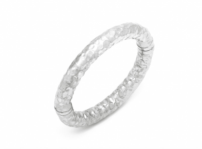 Il bracciale Stone Grande è realizzato da una lastra d'argento martellata a mano e successivamente piegata. Riflette la luce naturale in ogni direzione ed è perfetto da indossare in ogni occasione. Creato a mano in Italia, si presenta con apertura a molla.