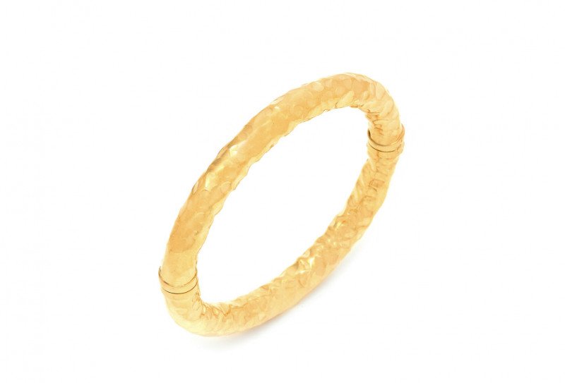Il bangle Stone Medio è realizzato da una lastra d'argento martellata a mano e successivamente piegata a mano e bagnata nell'oro. Si tratta di un bracciale luminoso perfetto da indossare in ogni occasione. Creato a mano in Italia, si presenta con chiusura a scomparsa.