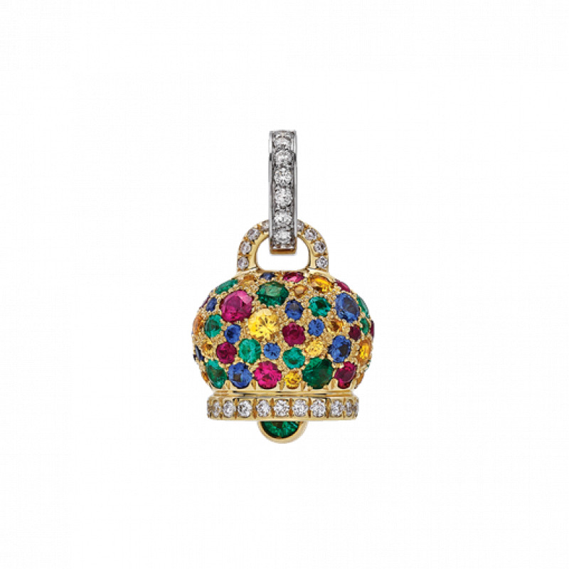 Ciondolo Chantecler Campanella media Mosaico in oro giallo e bianco 18Kt, diamanti e pavé di smeraldi, rubini, zaffiri blu, zaffiri orange, appartenente alla collezione Campanella.