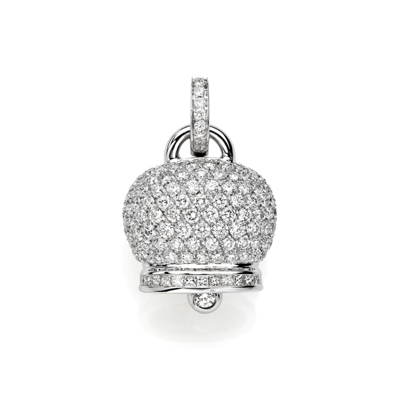 Qui il ciondolo Campanelle è in oro bianco e Pavé di diamanti. Oro a 18 kt.