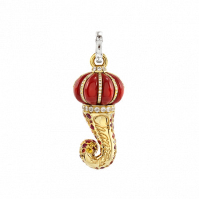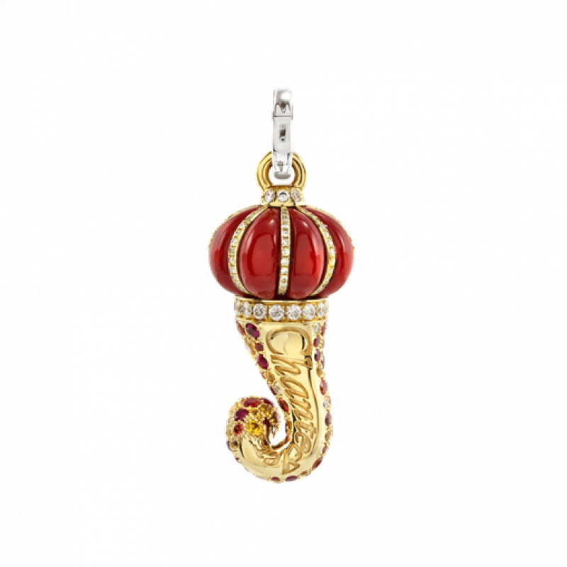 Ciondolo Chantecler Corno medio in oro giallo 18kt, diamanti, zaffiri gialli, zaffiri orange, rubini e corallo fesonato impreziosito da diamanti, collezione Corni.