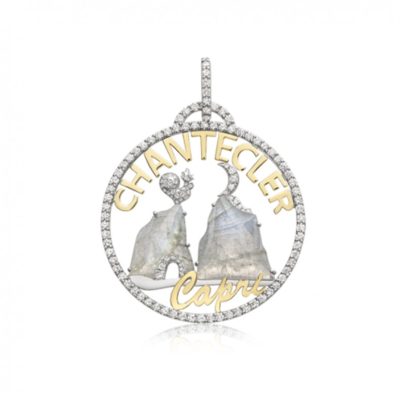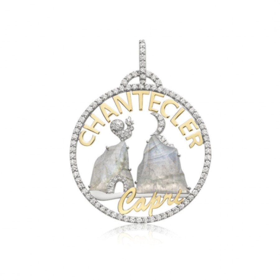 Ciondolo grande in oro bianco e giallo18Kt , diamanti bianchi e labradorite, appartenente alla collezione Logo.