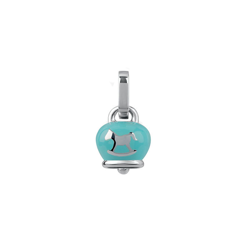 Ciondolo Chantecler Campanella in smalto azzurro perlato, con cavvallo a dondolo sul retro, appartenente alla collezione Et Voilà.