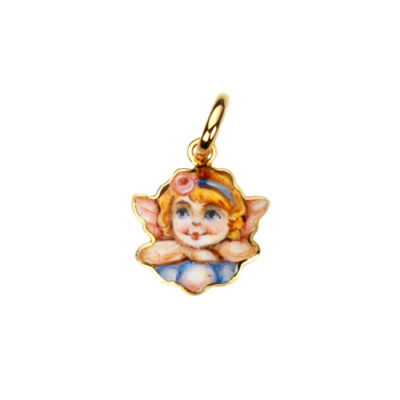 Ciondolo realizzato in oro 18 carati con Angioletto su nuvolette e ali color rosa. Il ciondolo è dipinto a mano con smalti a gran fuoco. Gli Angioletti sono da sempre un simbolo positivo di buon augurio associato alla Famiglia, regalo ideale sia per adulti e piccolini.