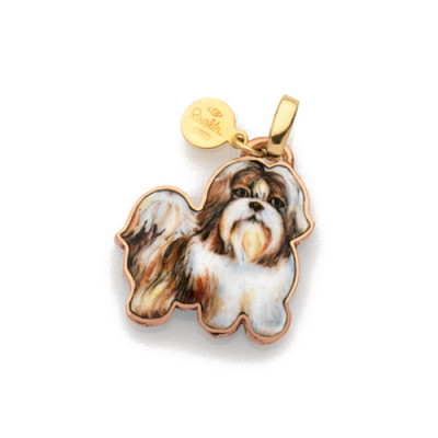 Dalla collezione Cuccioli, la linea di gioielli Gabriella Rivalta dedicata al mondo degli animali, qui il ciondolo interamente artigianale con cane shitzu. Il ciondolo è minuziosamente dipinto a mano con smalti a gran fuoco su sagoma in rame puro con biglierina e marchietto in oro 18 carati.