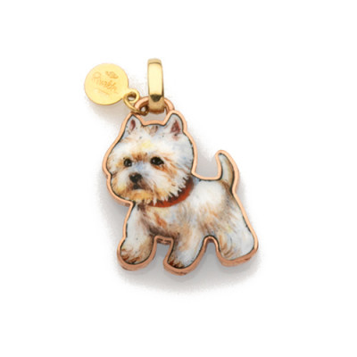 Dalla collezione Cuccioli, la linea di gioielli Gabriella Rivalta dedicata al mondo degli animali, qui il ciondolo interamente artigianale con cane shitzu. Il ciondolo è minuziosamente dipinto a mano con smalti a gran fuoco su sagoma in rame puro con biglierina e marchietto in oro 18 carati.