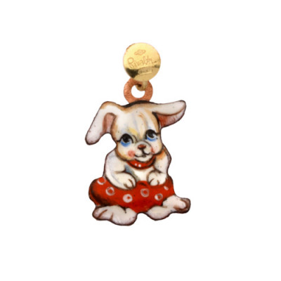 Qui il ciondolo interamente artigianale con Bianconiglio. Il ciondolo è minuziosamente dipinto a mano con smalti a gran fuoco su sagoma in rame puro con biglierina e marchietto in oro 18 carati.
