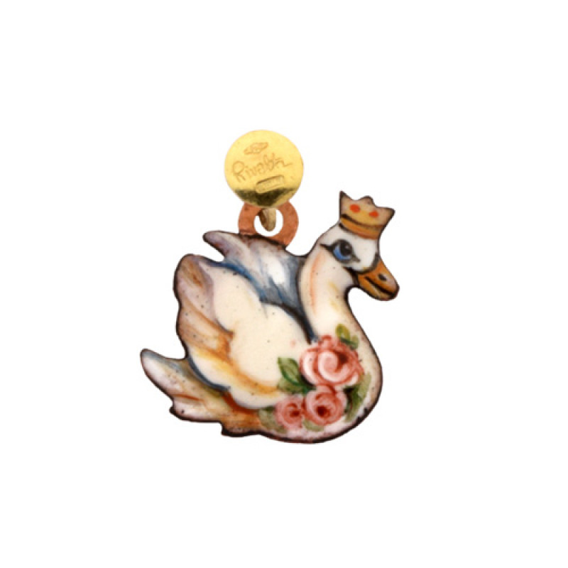 Qui il ciondolo interamente artigianale con Cigno. Il ciondolo è minuziosamente dipinto a mano con smalti a gran fuoco su sagoma in rame puro con biglierina e marchietto in oro 18 carati.