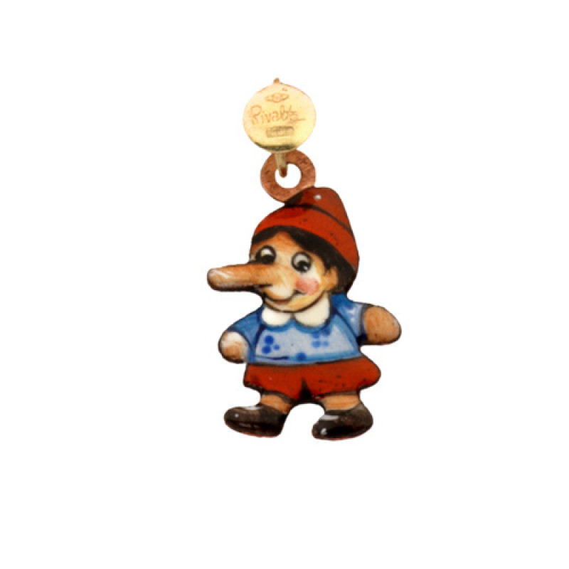 Qui il ciondolo interamente artigianale con Pinocchio. Il ciondolo è minuziosamente dipinto a mano con smalti a gran fuoco su sagoma in rame puro con biglierina e marchietto in oro 18 carati.