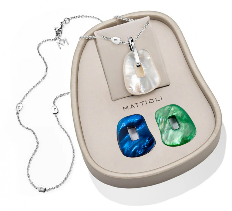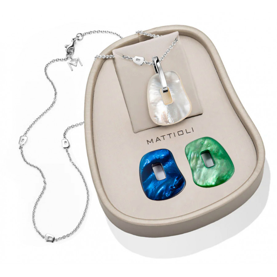 Box Ciondolo Mattioli medi e catenina in oro bianco e tre trapezi colorati intercambiabili della collezione Puzzle
