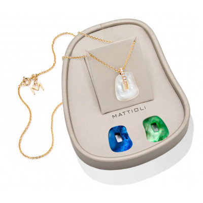 Box Ciondolo Mattioli piccoli e catenina in oro giallo, diamanti bianchi 0,18 ct. e tre trapezi colorati intercambiabili della collezione Puzzle