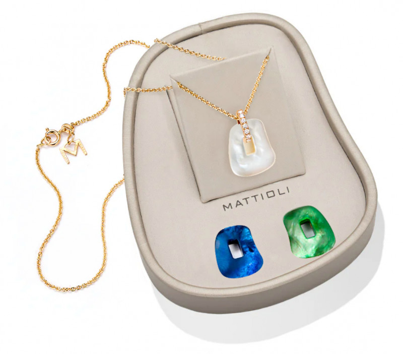 Box Ciondolo Mattioli medi e catenina in oro giallo e tre trapezi colorati intercambiabili della collezione Puzzle