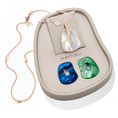 Box Ciondolo Mattioli medi e catenina in oro rosa e diamanti bianchi e tre trapezi colorati intercambiabili della collezione Puzzle