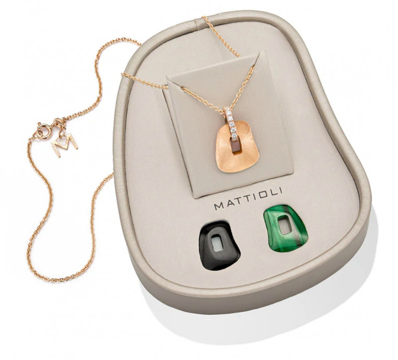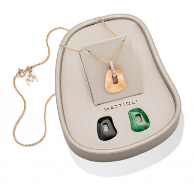 Box Ciondolo Mattioli piccoli e catenina in oro rosa, diamanti bianchi e tre trapezi di oro rosa, onice e malachite intercambiabili della collezione Puzzle