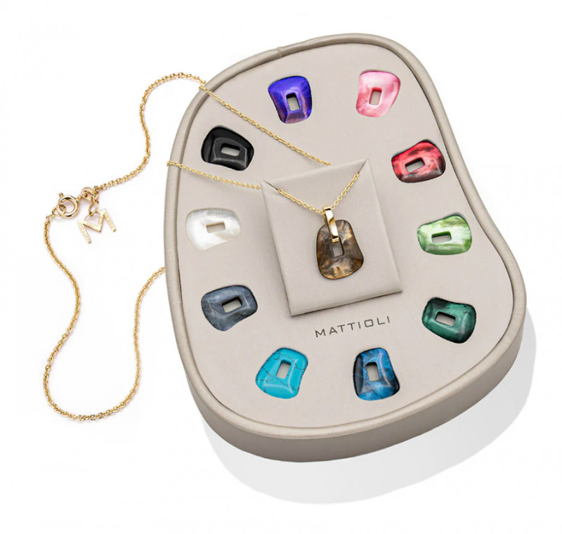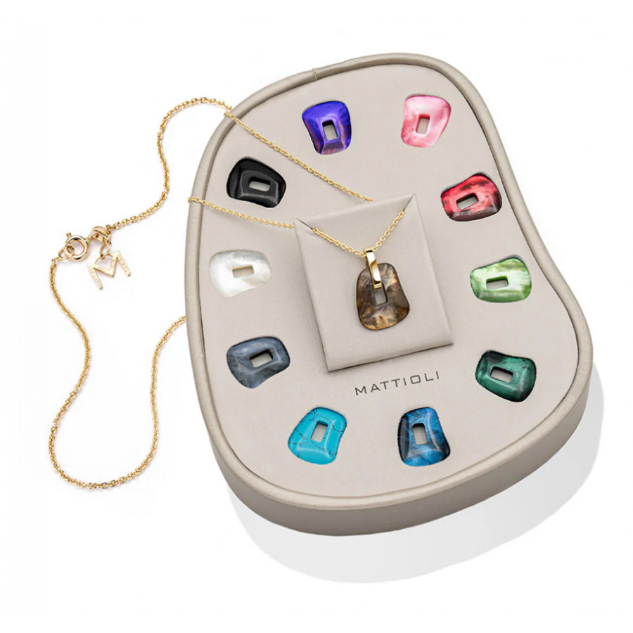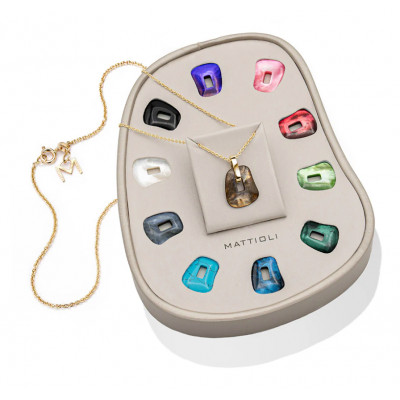 Box Ciondolo Mattioli piccoli e catenina in oro giallo e 11 trapezi colorati intercambiabili della collezione Puzzle