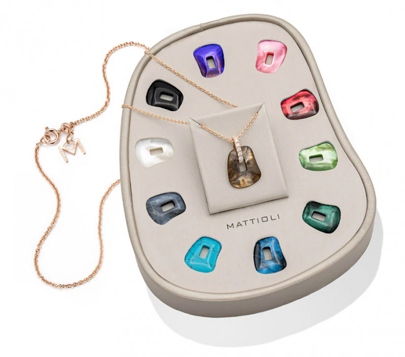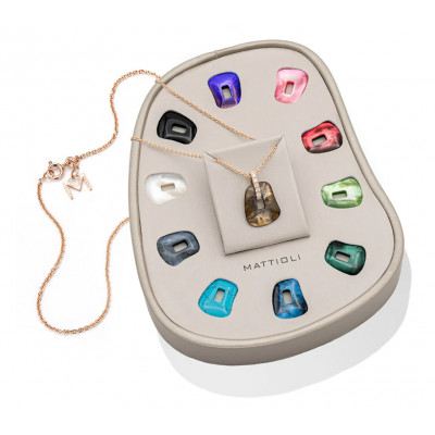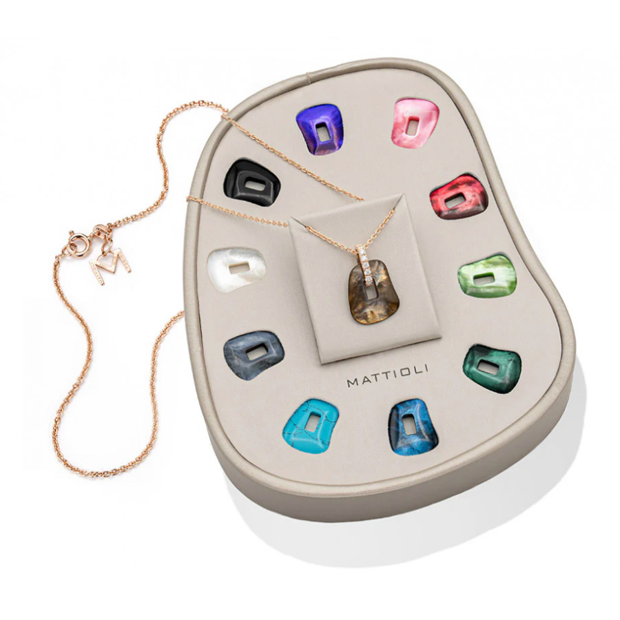 Box Ciondolo Mattioli piccoli e catenina in oro rosa, diamanti bianchi e 11 trapezi colorati intercambiabili della collezione Puzzle