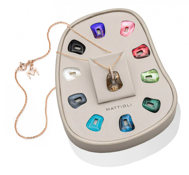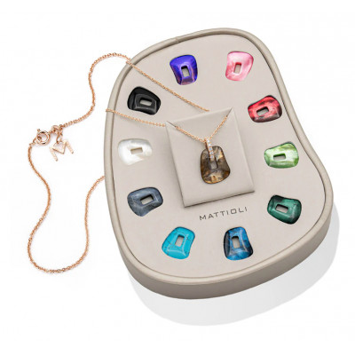 Box Ciondolo Mattioli piccoli e catenina in oro rosa, diamanti brown e 11 trapezi colorati intercambiabili della collezione Puzzle