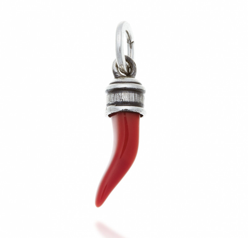 Un piccolo charm in argento con un piccolo corno rosso porta fortuna