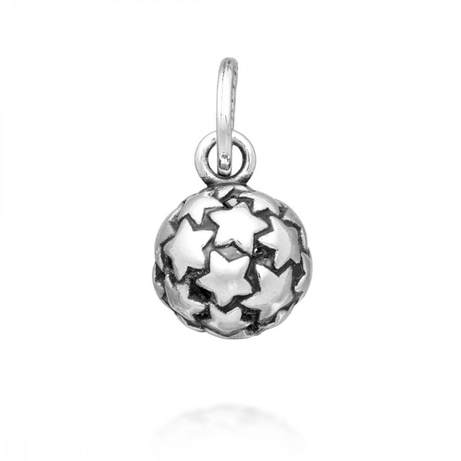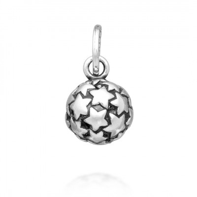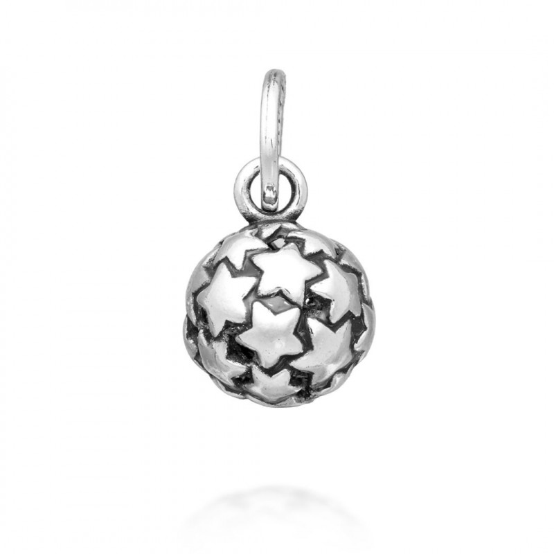 Questo ciondolo in argento brunito ha la forma di una sfera vuota all'interno e ricoperta da tante stelle lucidissime. Fatto completamente a mano in azienda, può essere usato per creare collane, bracciali o orecchini da sogno.