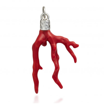 Un charm importante e colorato che si inserisce nella grande tradizione del brand Giovanni Raspini. E' realizzato con un elemento in argento fuso a cera persa, quindi martellato a mano, a cui è appeso un grande corallo rosso in resina ecologica.