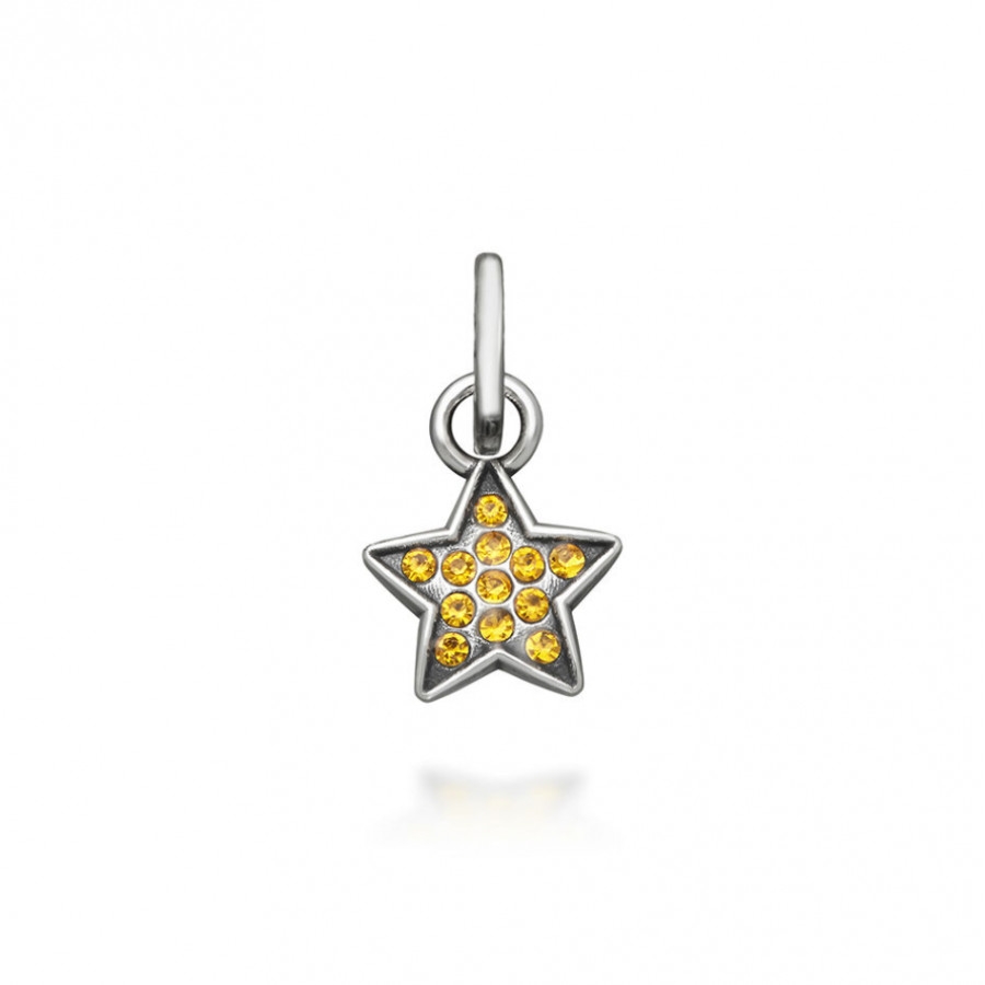 Piccoli capolavori. Mini charm in argento a forma di stella realizzato completamente a mano in azienda. Con una luminosità nuova e sorprendente, amplificata ancor più dai micro-zirconi gialli montati con effetto pavé.