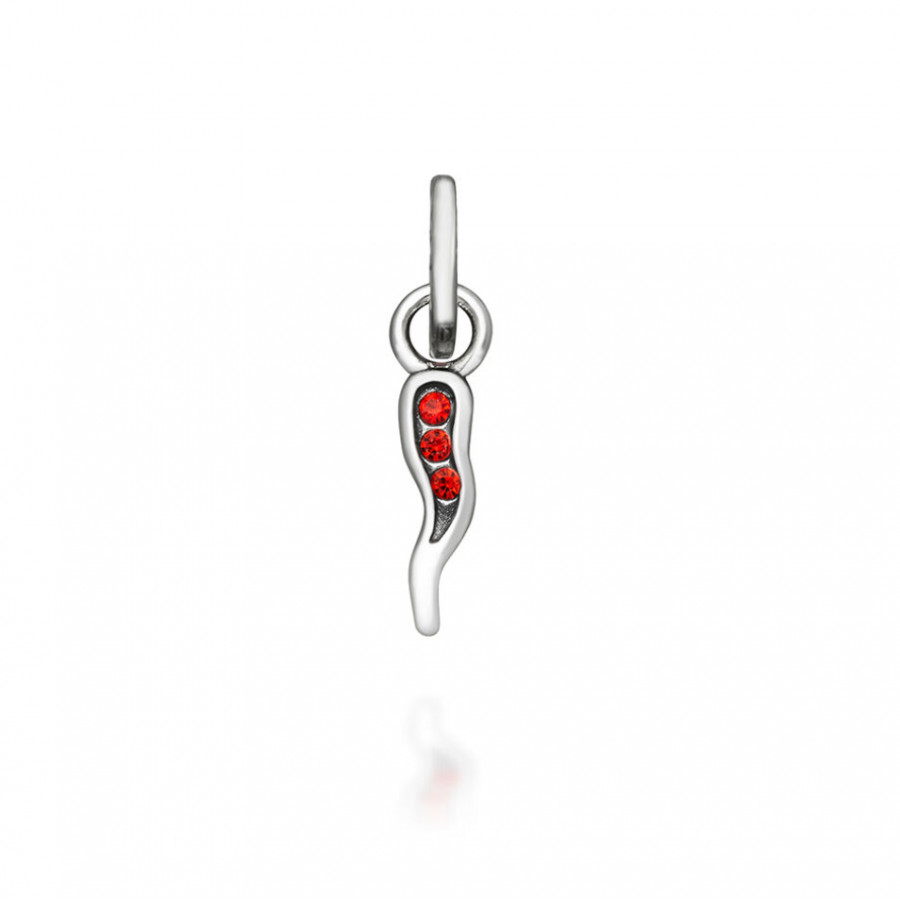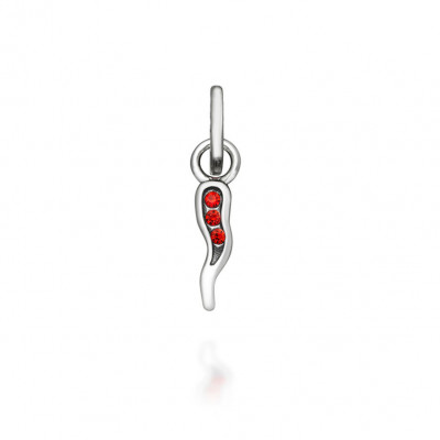 Un mini charm in argento a forma di cornino portafortuna realizzato completamente a mano in azienda. Con una luminosità sorprendente, amplificata ancor più dai micro-zirconi rossi montati con effetto pavé.